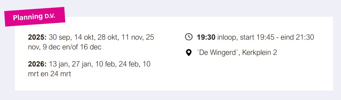 De kring wordt op dinsdagochtend gehouden in de Wingerd van 10 uur tot half 12. De eerste keer is op dinsdag 30 september 2025, allen van harte uitgenodigd. Kom ook gerust om een keertje mee te kijken. Meer informatie nodig? Bel gerust naar Lydia van der Weide.